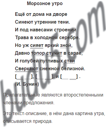 Прочитай стихотворение. Какую картину ты представляешь? У автора это стихотворение не имеет заглавия. А как бы ты его озаглавил? Спиши. Объясни постановку запятых: составь схемы предложений. Определи, какими членами предложения являются имена прилагательные – главными или второстепенными.