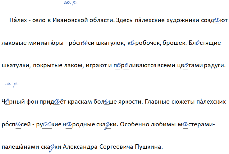 Па́лех - село в Ивановской области. Здесь па́лехские художники созд_ют лаковые миниатю́ры - ро́сп_си шкатулок, к_робочек, брошек. Бл_стящие шкатулки, покрытые лаком, играют и п_р_ливаются всеми цв_тами радуги. Ч_рный фон прид_ёт краскам бол_ше яркости. Главные сюжеты па́лехских ро́сп_сей - ру__кие н_родные ска_ки. Особенно любимы м_стерами-палеша́нами ска_ки Александра Сергеевича Пушкина.
