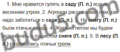1. Мне нравится гулять в саду ясным весенним утром. 2. Агроном рассказывал нам, как надо заботиться о саде. 3. На снегу были птичьи следы. 4. Жарким летом мы будем вспоминать о пушистом снеге. 5. В лесу раздавались птичьи трели.