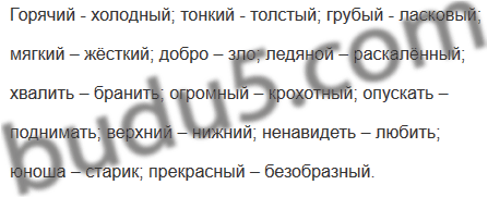 Горячий, тонкий, грубый, холодный, мягкий, добро, толстый, ласковый, ледяной, раскалённый, жёсткий, хвалить, огромный, опускать, поднимать, бранить, крохотный, верхний, ненавидеть, нижний, любить, зло, юноша, прекрасный, безобразный, старик.