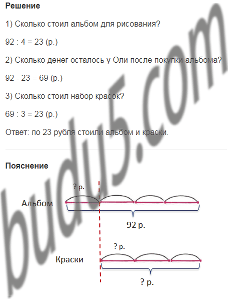 87. У Оли было 92 р. За альбом для рисования она заплатила четвёртую часть всех денег, а за набор красок - третью часть денег, которые остались после покупки альбома. Сколько стоил набор красок?