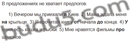 1) Вечером мы приехали Киев. 2) Мама ждала меня крыльце. 3) Я прочитал книгу начала конца. 4) Меня есть кошка и рыбки. 5) Мне нравятся фильмы шпионов.