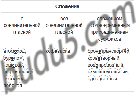 | с соединительной гласной | без соединительной гласной | сложением с одновременным присоединением суффикса |