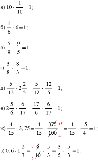 .В пунктах д) - з), чтобы найти произведение, преобразуем смешанные числа в неправильные дроби, и если возможно сокращаем их, а десятичные дроби в обыкновенные дроби и также, если возможно сокращаем их.