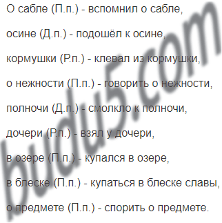 Сабля (П.п.), осина (Д.п.), кормушка (Р.п.), нежность (П.п.), полночь (Д.п.), дочь (Р.п.), озеро (П.п.), блеск (П.п.), предмет (П.п.).